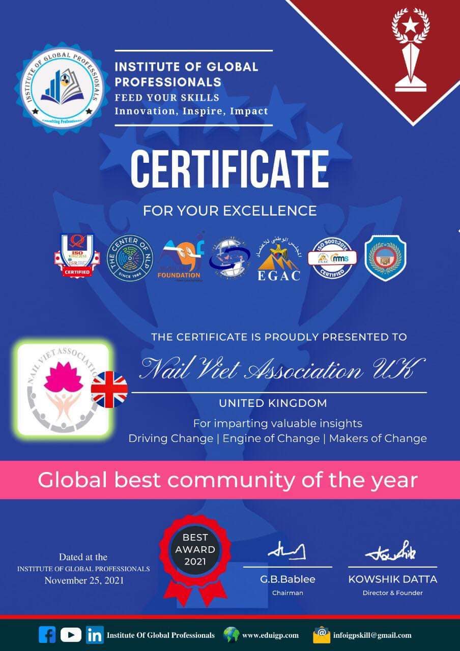 Trong đêm Gala chung kết, ông Nguyễn Trung Nam, chủ tịch Hiệp hội Nails Việt tại UK (NVAUK) đã chia sẻ sự ra đời của Hiệp hội, mục đích, ý nghĩa của sự kiện vinh danh ngành nails, cũng như kế hoạch phát triển cộng đồng ngành nails của NVAUK. Hiệp hội đã vinh dự nhận được giải thưởng “Global Best community of the year” (Cộng đồng tốt nhất toàn cầu của năm) do Viện các nghề nghiệp chuyên môn toàn cầu trao tặng.