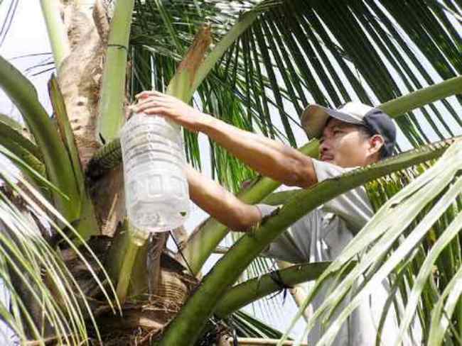 Một bông hoa dừa 12 tiếng lại cho thu mật một lần, mỗi lần được khoảng nửa lít.