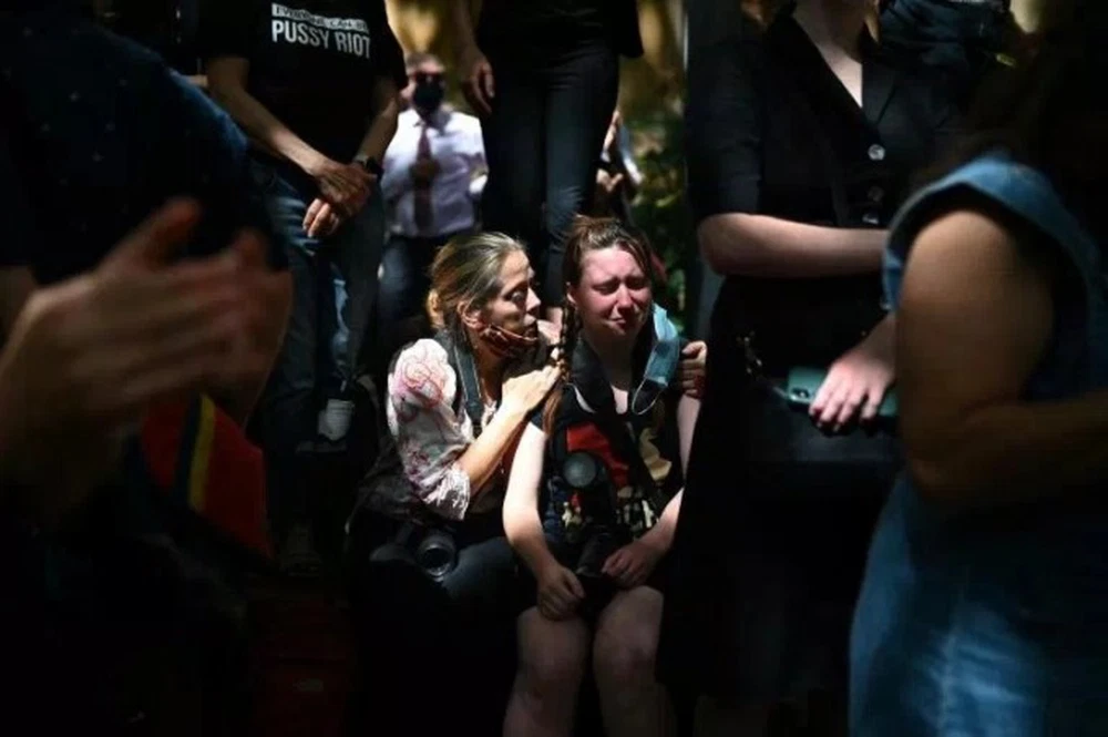 Một phụ nữ ngồi khóc khi xuống đường tuần hành đòi bình đẳng giới và lên án tấn công tình dục nơi công sở. Ảnh: AFP