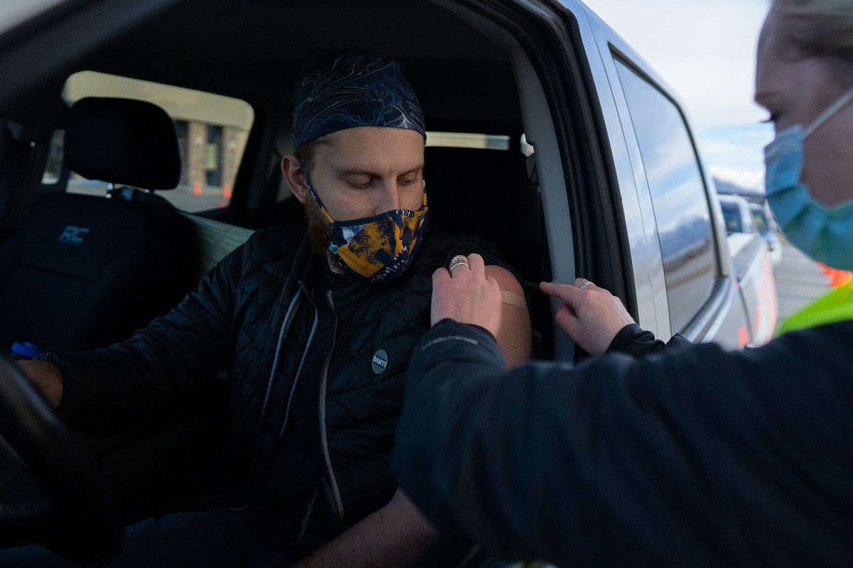 Một người đàn ông nhận mũi tiêm tăng cường ngay trên xe ở Anchorage, bang Alaska, Mỹ hồi tháng 10. Ảnh: New York Times.