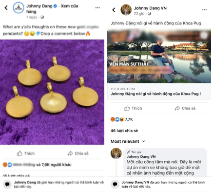 Ngay sau khi Khoa Pug tung vlog “bóc trần”. Fanpage cá nhân và fanpage cửa hàng trang sức bên Mỹ của Johnny Đặng chịu sự tấn công gay gắt từ cư dân mạng với hàng nghìn bình luận tiêu cực. Có thể do vậy mà đội ngũ quản trị phía Johnny Đặng đã bật chức năng lọc bình luận.