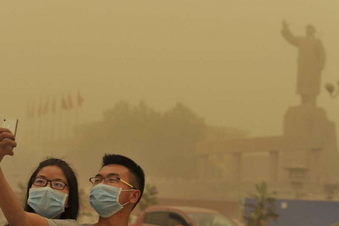 Hai người chụp ảnh trong cơn bão cát ở Kashgar, Tân Cương, Trung Quốc. Ảnh: Reuters