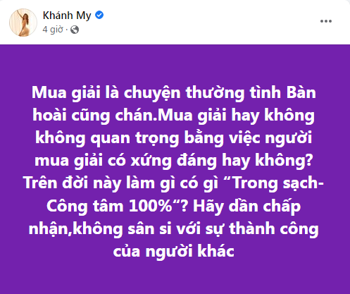 Khánh My viết: "Mua giải là chuyện thường tình, bàn hoài cũng chán. Mua giải hay không không quan trọng bằng việc người mua giải có xứng đáng hay không? Trên đời này làm gì có gì trong sạch, công tâm 100%? Hãy dần chấp nhận, không sân si với sự thành công của người khác".
