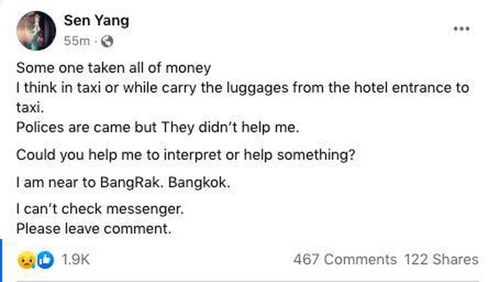 Sen Yang chia sẻ rằng, cô không biết rõ mình bị mất tiền ở đâu: "Tôi nghĩ mình bị mất cắp trên xe taxi hoặc là lúc đang xách vali từ khách sạn ra tới chỗ xe taxi đang chờ. Cảnh sát có tới nhưng họ không giúp đỡ tôi. Ai đó có thể giúp tôi thông dịch với họ được không. Tôi ở gần khu quận Bang Rak (Bangkok). Hiện tại tôi không thể đọc tin nhắn, làm ơn hãy để lại bình luận".