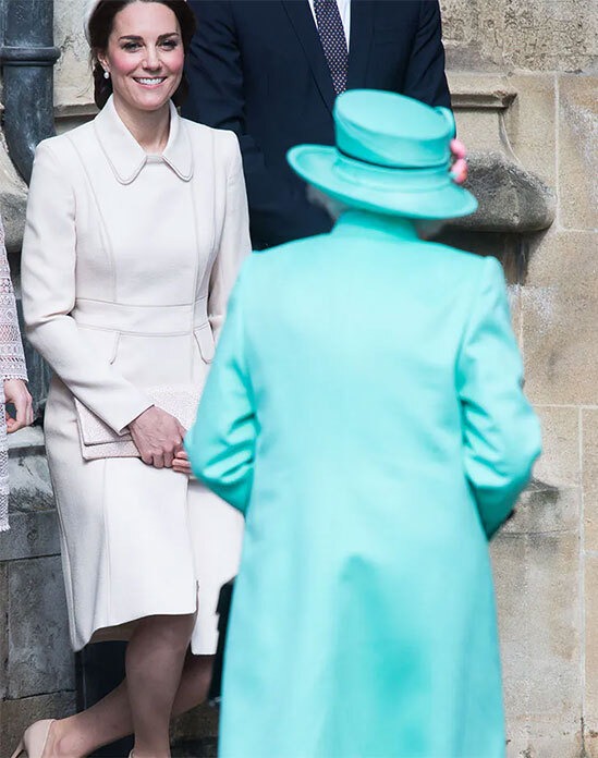 Nữ công tước xứ Cambridge nhún gối chào Nữ hoàng. Ảnh: PA