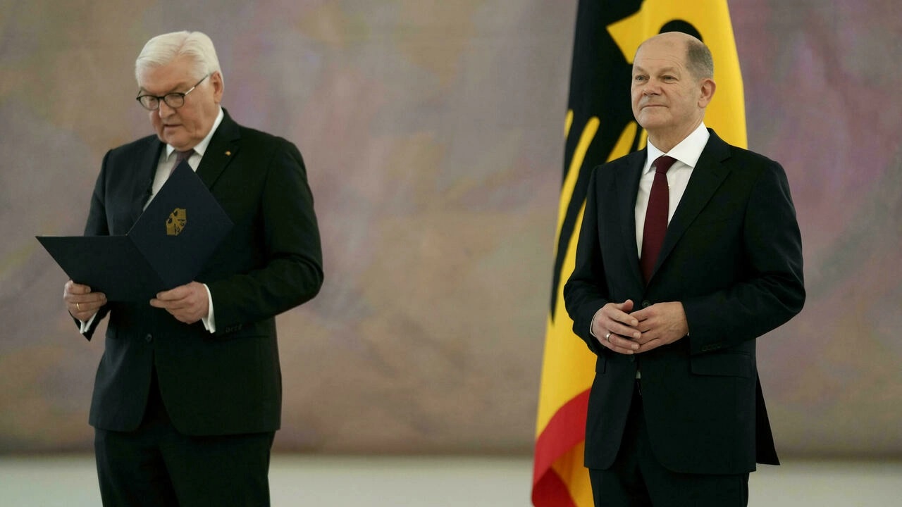 Tân thủ tướng Đức Olaf Scholz (P) trong lễ bổ nhiệm tại dinh tổng thống Bellevue Palace, Berlin, Đức, ngày 08/12/2021. AP - Michael Sohn