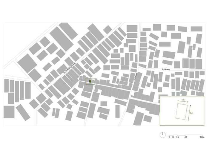Công trình TH house nằm trên một khu đất chật hẹp chỉ 4 x 6 m ngay giữa trung tâm Hà Nội. Ngôi nhà chỉ có duy nhất một hướng mặt tiền hướng ra con ngõ hẹp rộng 1,2 m.