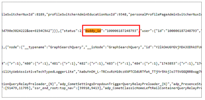 Trình duyệt tự động mở một trang tab kế tiếp và sẽ hiện các dòng code HTML. Những dòng code này sẽ hơi rối mắt và khó hiểu nhưng bạn không cần quan tâm đến nó đâu. Giờ hãy ấn tổ hợp phím tìm kiếm Ctrl F và copy dán dòng chữ "buddy_id" vào ô tìm kiếm. Bạn sẽ tìm thấy ngay dòng "buddy_id" trong trang code, theo sau là các dãy số có dạng 10000xxxxxxxxxx. Đó chính là những người hay vào Facebook của bạn.
