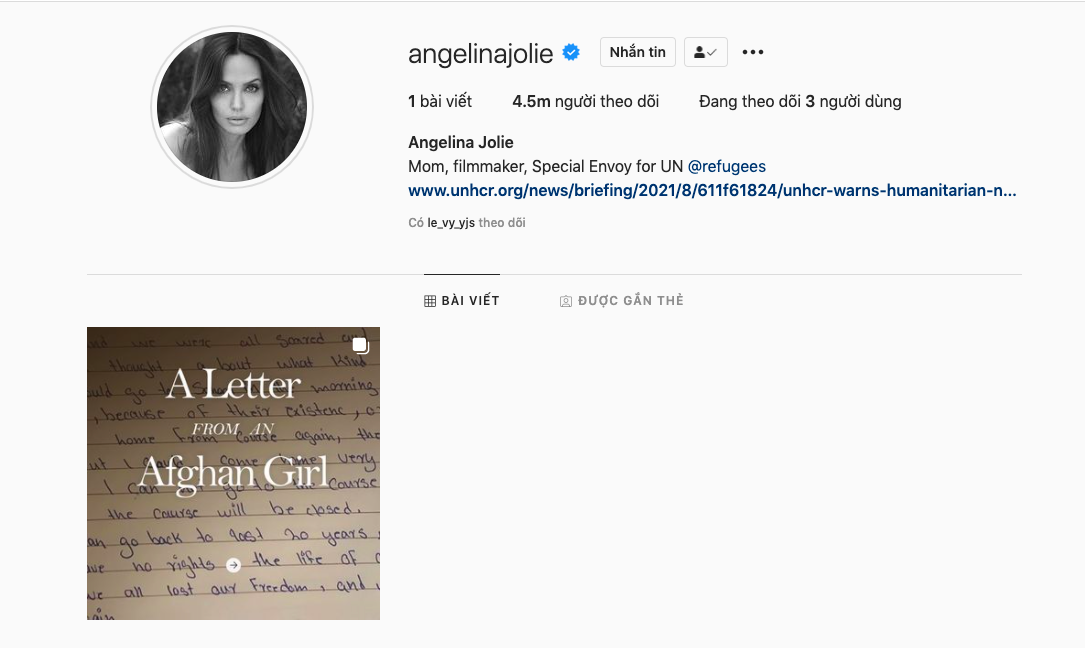 Vào ngày 21/8 vừa qua, nữ minh tinh của Hollywood - Angelina Jolie chính thức dấn thân vào mạng xã hội Instagram. Thông tin này khiến các fan hâm mộ cũng như netizen khắp thế giới khá bất ngờ. Vào thời điểm đó, tài khoản @angelinajolie hiện đã có gần 2 triệu người theo dõi chỉ sau hơn 2 tiếng đồng hồ.