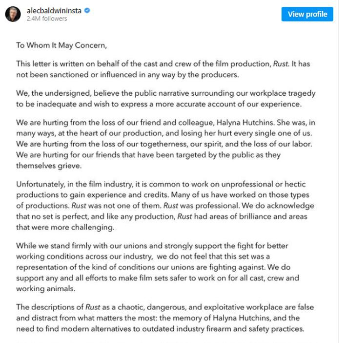 "Những mô tả về Rust như một nơi làm việc hỗn loạn, nguy hiểm, bóc lột là sai sự thật nhằm đánh lạc hướng những gì quan trọng nhất: ký ức về nữ đạo diễn hình ảnh Halyna Hutchins và nhu cầu tìm kiếm các giải pháp thay thế hiện đại cho việc sử dụng vũ khí đã lỗi thời trong ngành", bức thư do Alec Baldwin chia sẻ, có chữ ký của 25 diễn viên và thành viên đoàn phim Rust ghi rõ.
