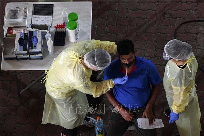 Nhân viên y tế lấy mẫu xét nghiệm COVID-19 cho người dân tại Singapore. Ảnh: AFP/TTXVN