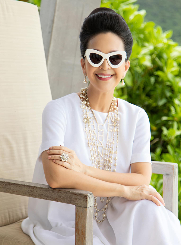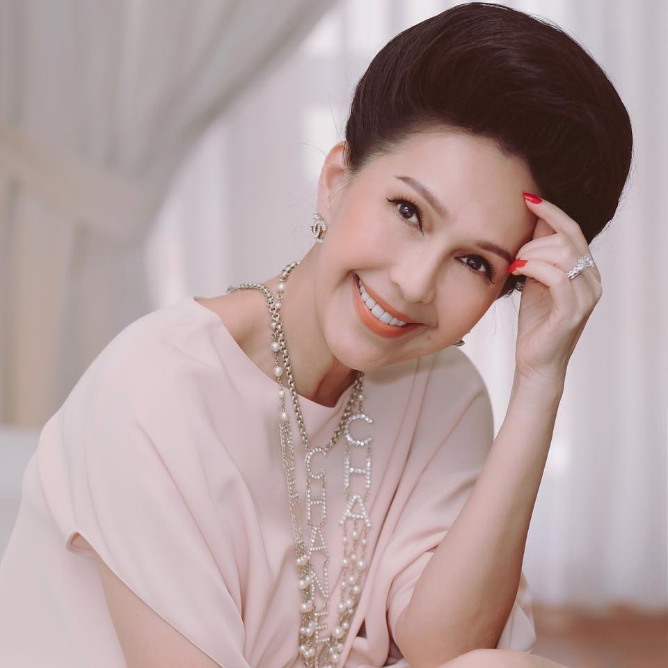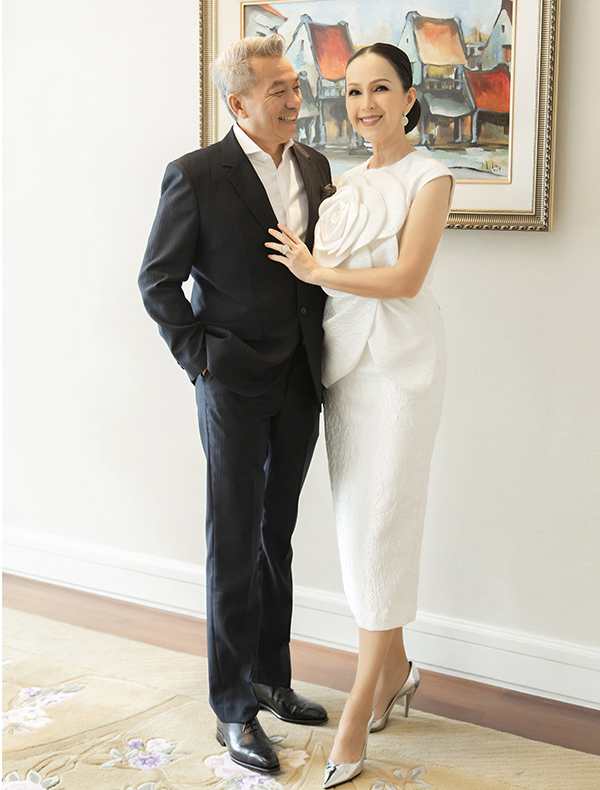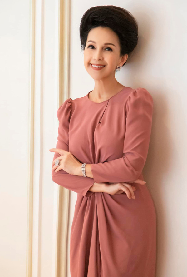 Trong buổi tiệc sinh nhật đón tuổi 59, diễn viên diện đầm trắng ôm sát với điểm nhấn là bông hoa trà to bản. Nhiều năm nay, chị trung thành với kiểu tóc bới, phần mái thường được chải cao, gọn gàng.