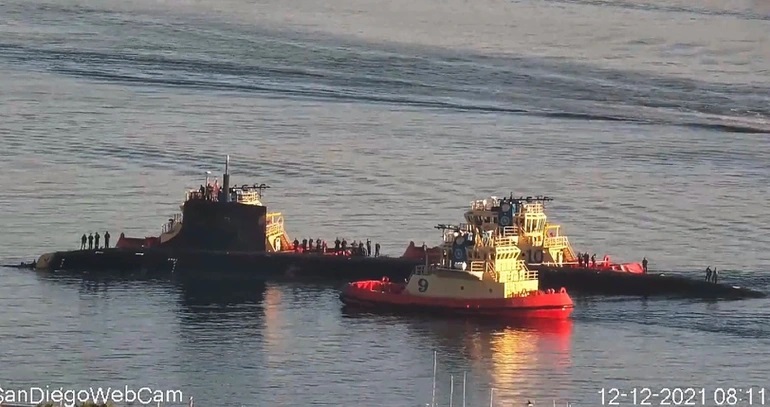 Tàu ngầm hạt nhân USS Connecticut di chuyển vào cảng San Diego sáng 12/12 sau khi di chuyển trên mặt nước hơn 9.000 km từ đảo Guam (Ảnh: Twitter).
