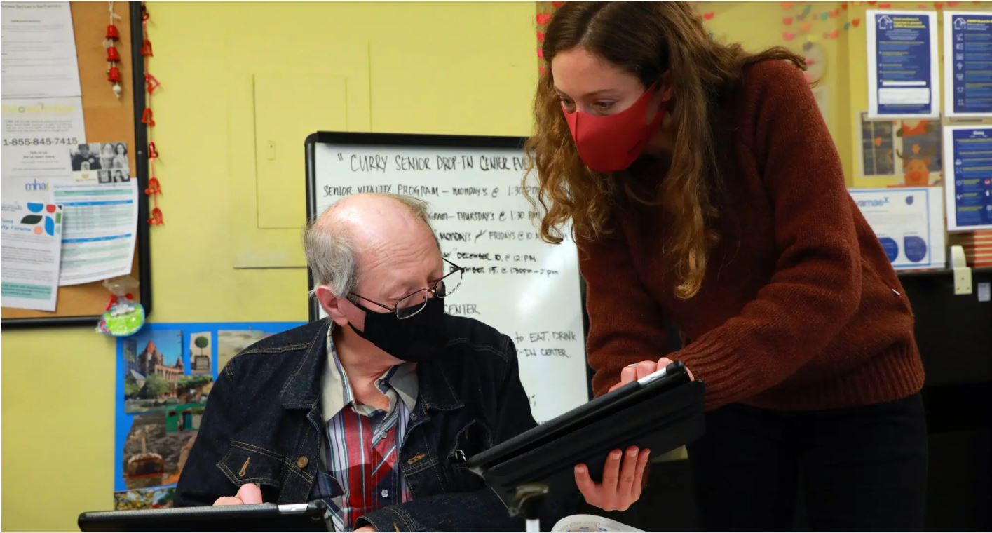Tại Trung tâm chăm sóc người cao tuổi Curry ở San Francisco, các cụ ông, cụ bà được hướng dẫn máy tính bảng để liên lạc với bạn bè và người thân. Ảnh: New York Times