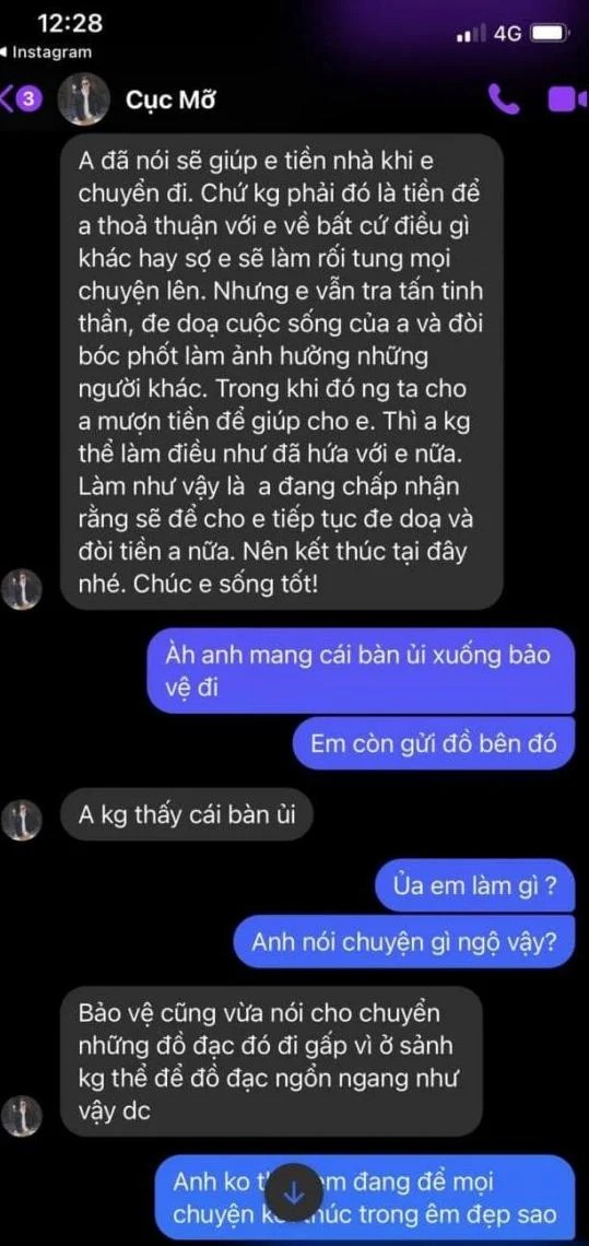 Theo tin nhắn thì vì lấy tiền của bạn gái nên khi cô vừa chuyển ra khỏi ra, Anh Đức nói sẽ hỗ trợ cho Uyên Tô 50 triệu đồng để trả tiền nhà. Tuy nhiên, sự phũ phàng của bạn trai cũ khiến cô bức xúc và phải đòi lại hết nhưng nam diễn viên vẫn nhất quyết không đưa.