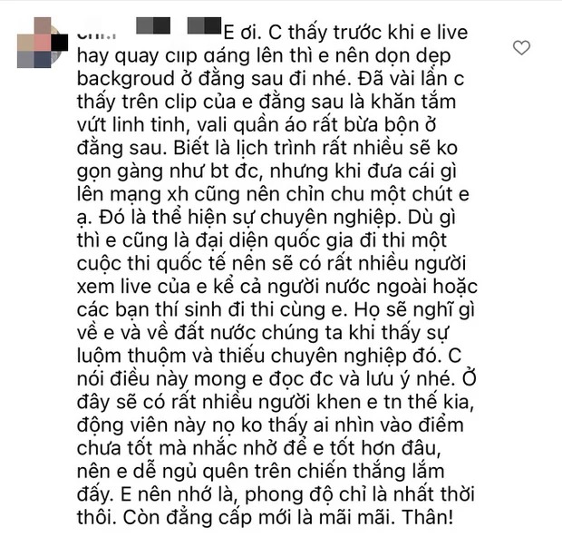 "Biết là lịch trình rất nhiều sẽ không gọn gàng như bình thường được nhưng khi đưa cái gì lên mạng xã hội cũng nên chỉn chu 1 chút em ạ. Đó là thể hiện sự chuyên nghiệp. Dù gì em cũng là đại diện 1 quốc gia đi một cuộc thi quốc tế nên nhiều người xem live của em. Em nên nhớ phong độ chỉ là nhất thời, đẳng cấp mới là mãi mãi", netizen nhắc nhở thẳng Đỗ Hà.
