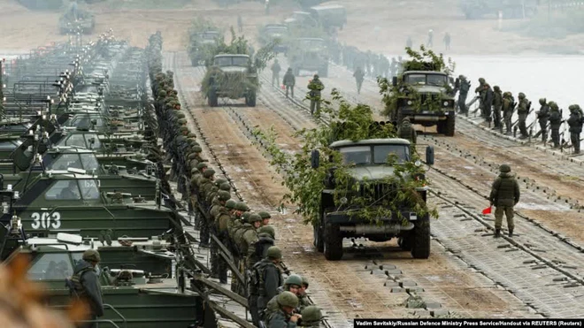 Công binh Nga bắc cầu phao vượt sông trong cuộc tập trận chung với Belarus.