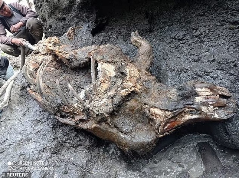 Phần c̣n lại của một con tê giác lông, đă tuyệt chủng khoảng 14.000 năm trước, được đào ra khỏi lớp băng vĩnh cửu vào tháng 7/2021. Ảnh: Reuters
