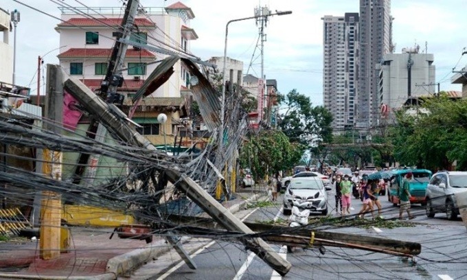Cột điện bị đổ tại thành phố Cebu, miền trung Philippines, hôm 17/12, sau khi bão Rai quét qua. Ảnh: AP.