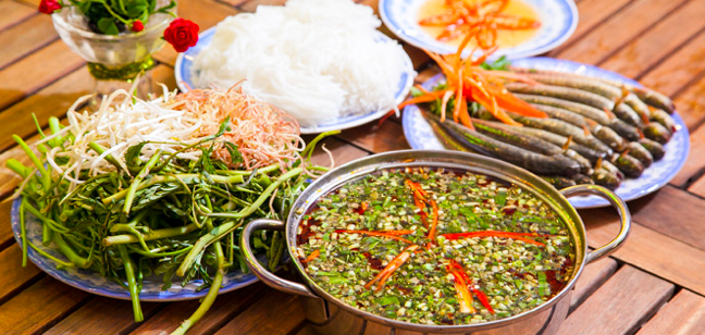 Món ăn tăng thêm phần hương vị khi dùng kèm với các loại rau: rau muống, hoa chuối bào, rau ngổ, ngò gai… bún tươi.