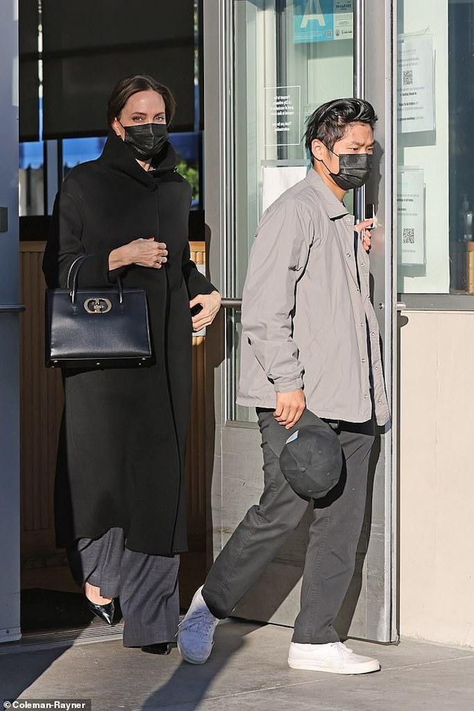 Nữ diễn viên phim Eternals trung thành với phong cách thanh lịch, sang trọng khi diện quần ống loe xám kết hợp cùng áo măng tô đen tôn vóc dáng cao ráo, mảnh mai. Cô trang điểm đơn giản và đeo túi xách da của Dior. Pax Thiên trông giản dị hơn với quần tối màu, giày thể thao trắng, áo phông basic kết hợp cùng sơ mi xám nhạt. Cậu hai nhà Jolie-Pitt vừa đón tuổi 18 vào cuối tháng trước.