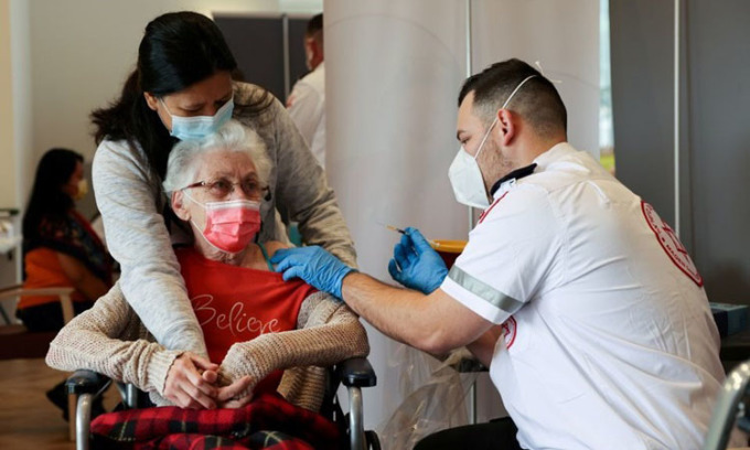 Cụ bà được tiêm mũi vaccine Covid-19 tăng cường tại một điểm tiêm chủng ở thành phố Netanya, Israel, ngày 19/1. Ảnh:Reuters.