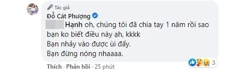 Cát Phượng cũng bất ngờ cho biết đã chia tay được 1 năm. Cô đồng thời mỉa mai ngược dân mạng này nên "tiếp cận" người ấy của cô. "Chúng tôi đã chia tay 1 năm rồi sao bạn không biết điều này ạ. Bạn nhảy vào được rồi đấy. Bạn đừng nóng nha", Cát Phượng cho hay.