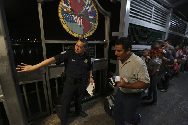 Một sĩ quan Hoa Kỳ hướng dẫn một gia đình di cư Nicaragua đến cơ quan di trú để phỏng vấn. Ảnh minh họa: apnews.com
