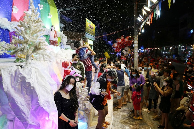 Dẫn 2 con đi chơi lần đầu sau nhiều tháng ở nhà phòng dịch, chị Thanh Như, 36 tuổi, cho biết, phải chạy xe máy hơn một giờ từ quận Gò Vấp đến xóm đạo để cho con chụp ảnh. "Chen chúc nhau để chạy xe, chụp ảnh cũng mệt mỏi nhưng bù lại ở đây hai con tôi được thấy ông già Noel, đèn giăng khắp nơi như kỷ niệm vui trong một năm dịch kéo dài", chị Như nói.