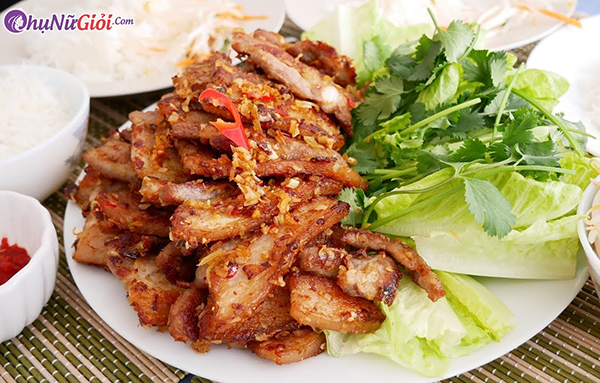 Cuối cùng, trình bày thịt ba chỉ nướng ra đĩa và ăn kèm với bún, cơm hoặc cuốn bánh tráng, các loại rau thơm và chấm nước mắm chua ngọt.