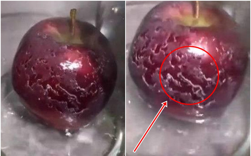 Nguyên nhân là bởi sau khi tiếp xúc với nước nóng, quả táo dần dần chuyển màu. Không chỉ vậy, lớp vỏ ngoài vốn trơn bóng của nó bỗng xuất hiện một lớp bột nhão màu trắng nhìn trông hết sức kỳ dị.