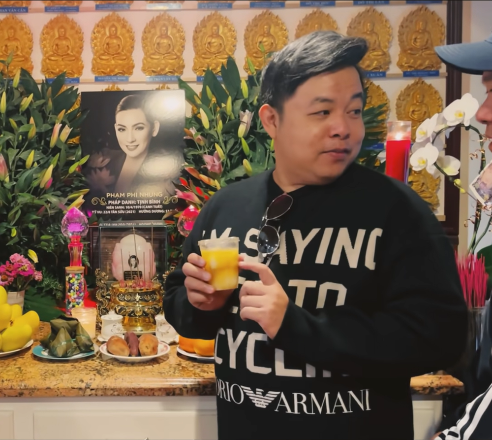 Tiếp đó, anh cầm cốc chè trên bàn thờ Phi Nhung lên và nói: "Chị Phi Nhung hồi còn sống mê ăn chè lắm. Có một thời gian chị ấy bị mập lên vì ăn chè nhiều. Nhưng chị ấy cũng nỗ lực, đến gần ngày quay hình là giảm cân. Mọi người đều biết nên giờ vẫn cúng chè cho chị.