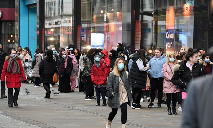 Đoàn người chờ bên ngoài cửa hàng ở thành phố Manchester, Anh ngày 26/12. Ảnh: Manchester Evening News.