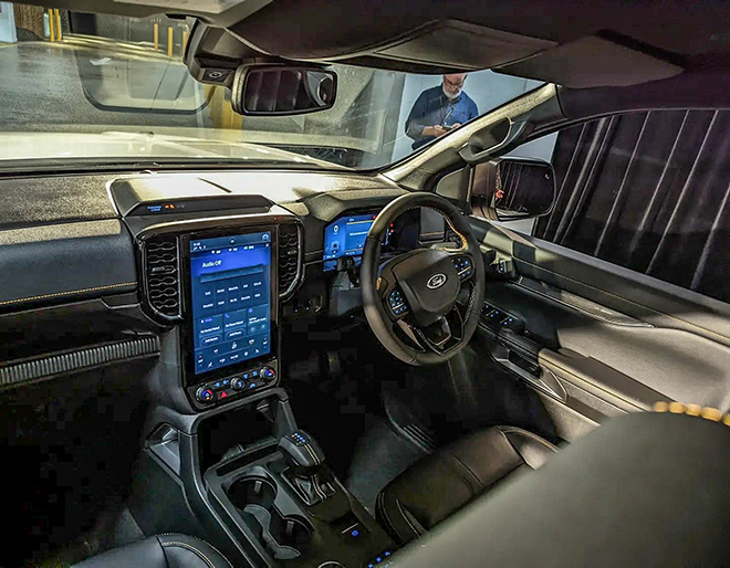 Nội thất Ford Ranger thế hệ mới phiên bản V6 được trang bị màn hình giải trí trung tâm đặt dọc kích thước 12 inch. Hệ thống ra lệnh bằng giọng nói SYNC4. Màn hình hỗ trợ lái kỹ thuật số. Nâng cấp phanh tay điện tử và các chế độ lái được chuyển sang điều khiển bằng núm xoay.