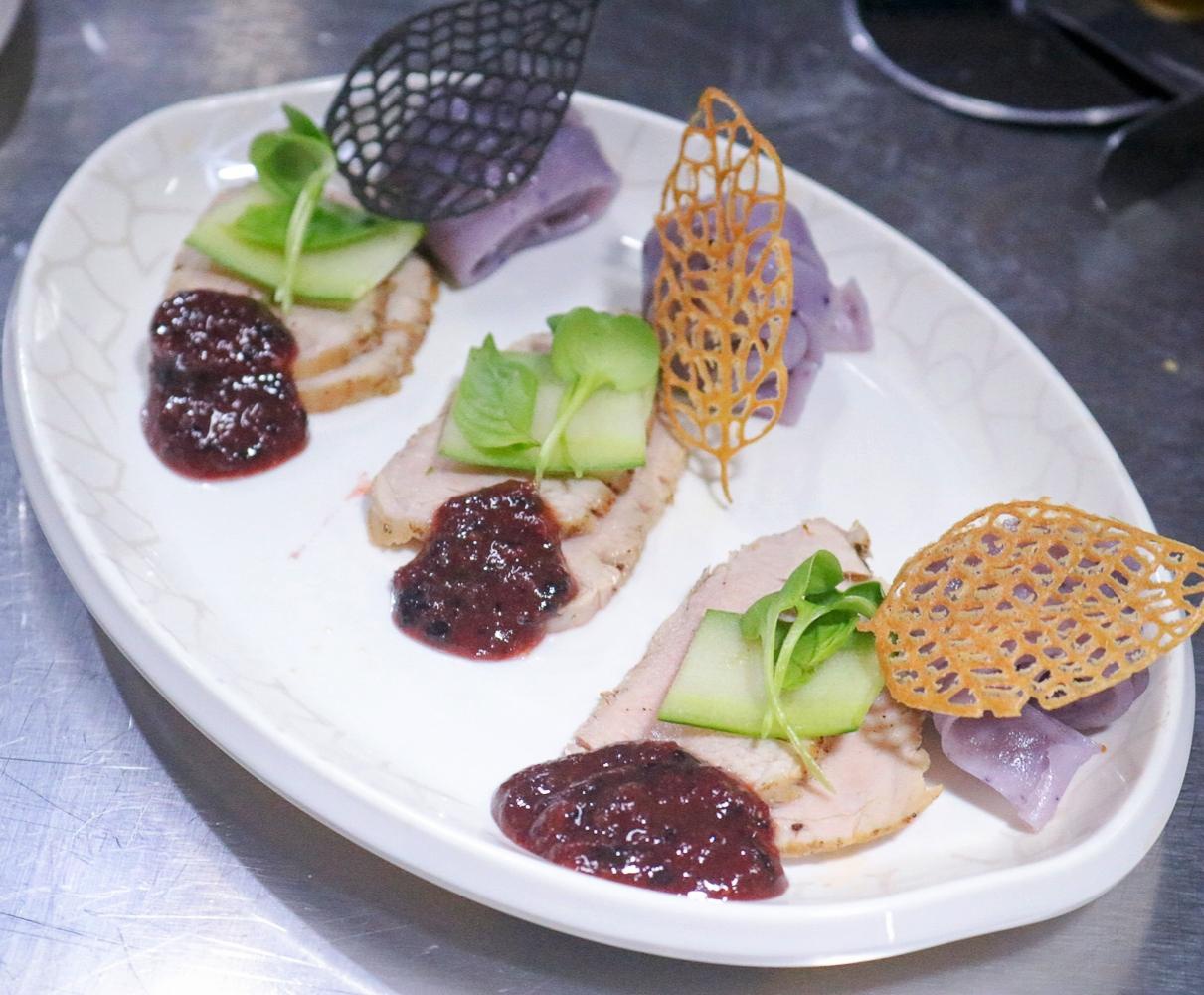Đầu bếp Nguyễn Thành Long mang đến món giò heo hầm việt quất và bánh xu xê. Với sự đầu tư bài bản, Long là thí sinh quán quân cuộc thi.