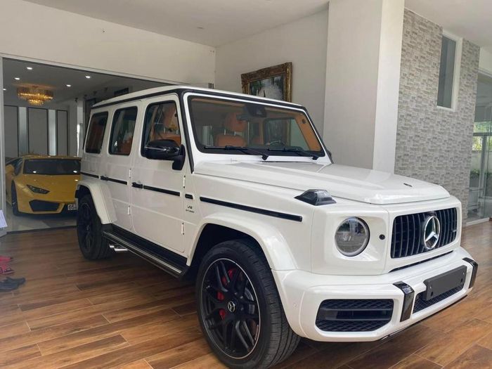 Chiếc SUV hạng sang Mercedes-AMG G63 mới về garage của đại gia Cần Thơ có ngoại thất màu trắng cùng các chi tiết được sơn đen tương phản. Xe sở hữu bộ mâm tùy chọn đa chấu kép sơn đen mờ đi kèm kẹp phanh màu đỏ nổi bật có giá tại nước ngoài 103 triệu đồng.