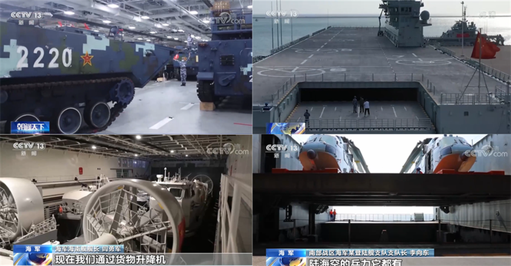 Ảnh chụp bên trong tàu Type 075 Hải Nam: xe bọc thép, tàu đổ bộ đệm khí, trực thăng đang được nâng lên boong và mặt boong tàu (Ảnh: CCTV).