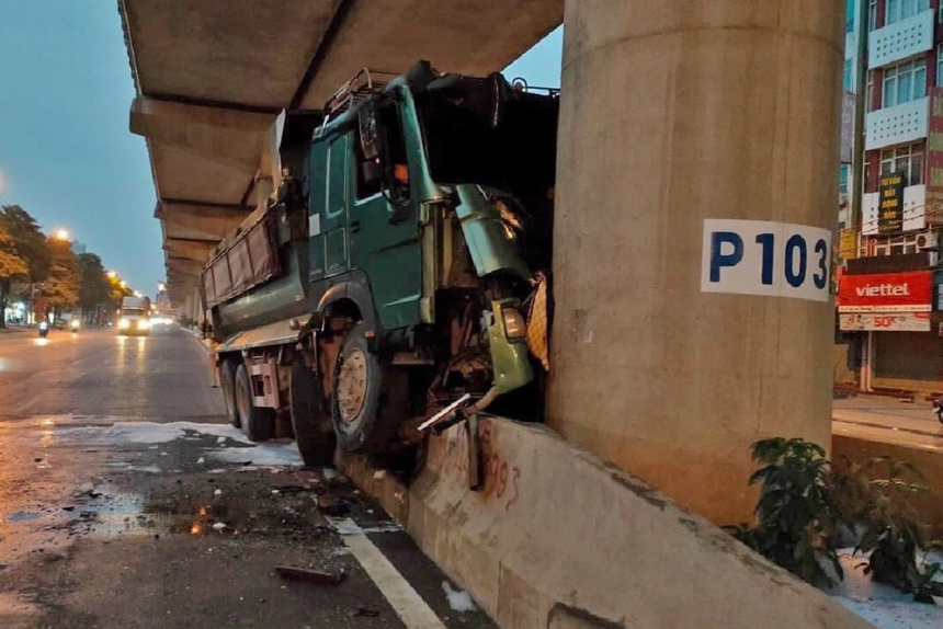 Tại hiện trường đầu xe tải biến dạng, một phần trụ P103 của tuyến đường sắt đô thị số 3 Nhổn - Ga Hà Nội có dấu hiệu bị cháy đen.