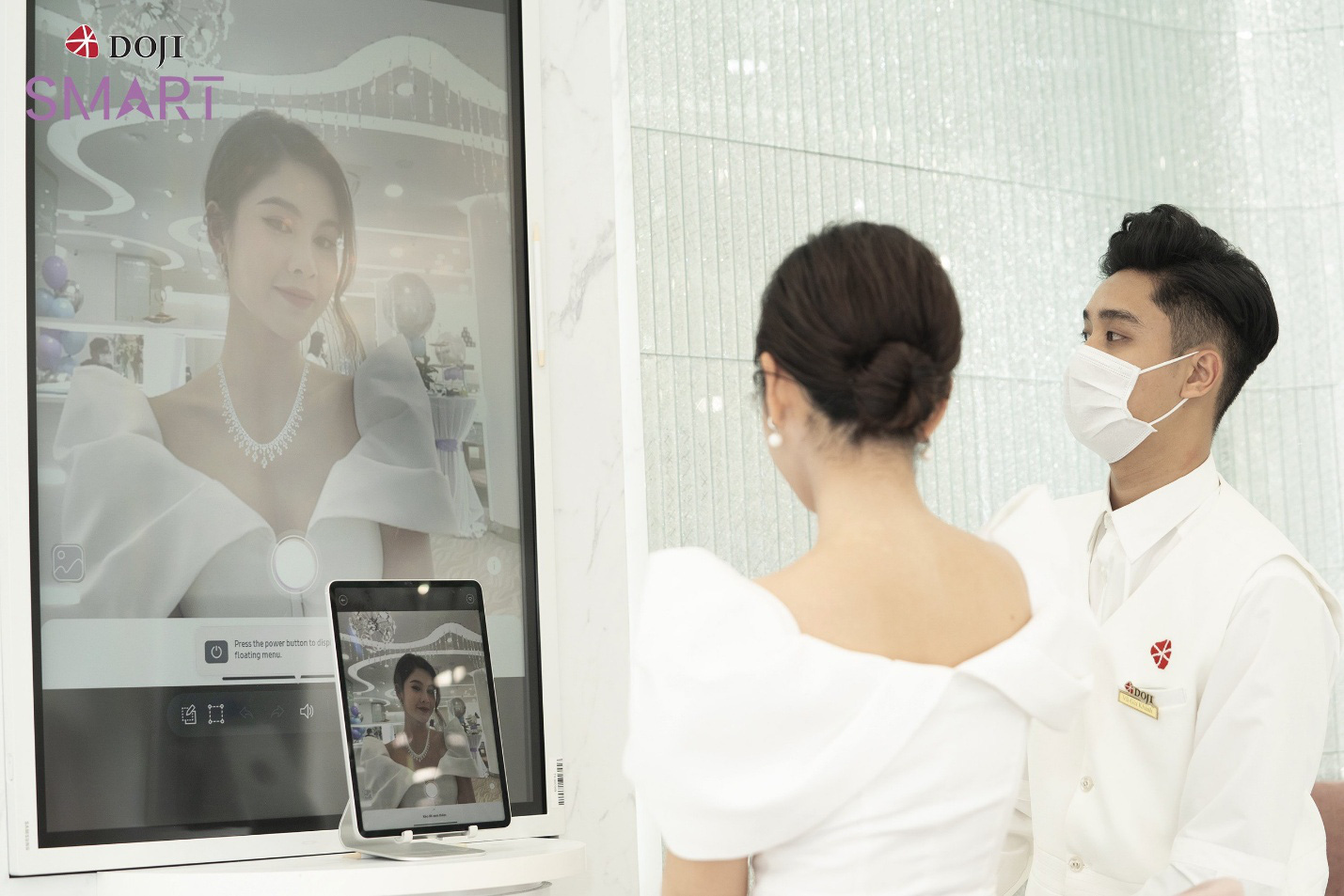 Cô hào hứng trải nghiệm ứng dụng công nghệ tại DOJI Smart để tìm kiếm món trang sức phù hợp cho mình