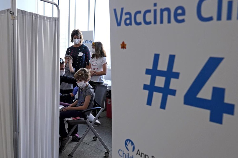 Một bé trai 8 tuổi được tiêm chủng tại Chicago, Mỹ (Ảnh: AP).