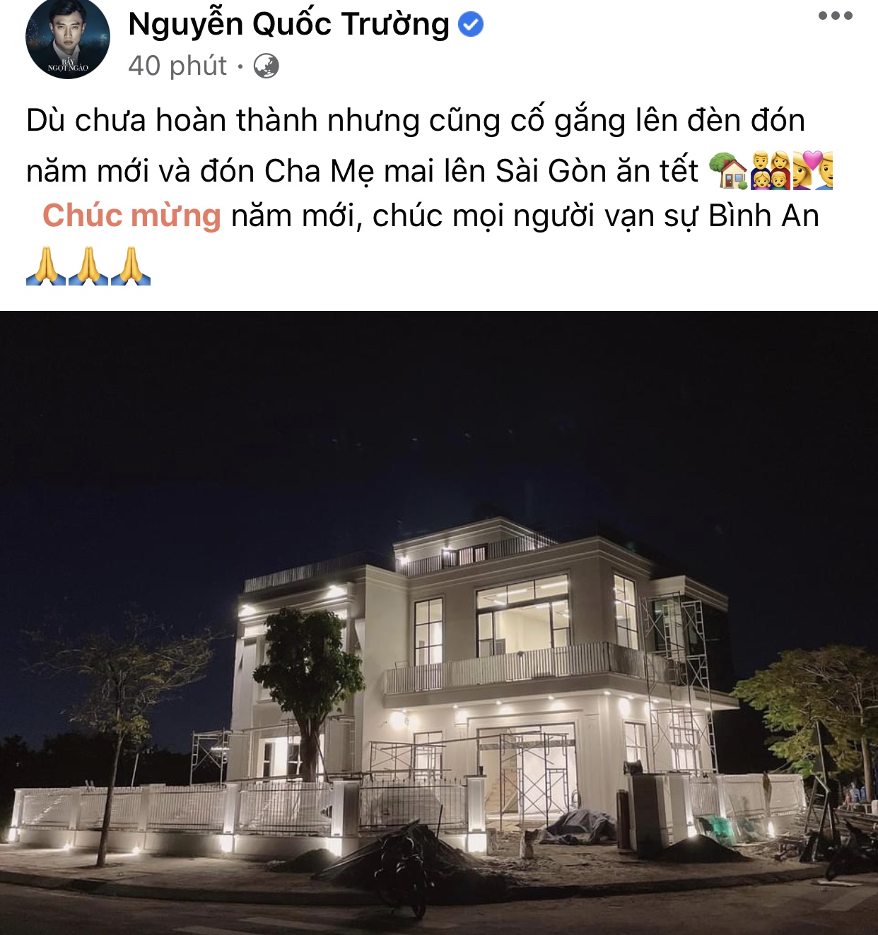 Tối 31/12, nam diễn viên Về Nhà Đi Con đăng tải bức hình trên Facebook thu hút sự chú ý và quan tâm của người hâm mộ. "Dù chưa hoàn thành nhưng cũng cố gắng lên đèn đón năm mới và đón cha mẹ mai lên Sài Gòn ăn Tết", Quốc Trường chia sẻ. Nam diễn viên đăng tải hình ảnh căn biệt thự đang được xây dựng, hoàn thiện. Có thể thấy tổ ấm mới này của Quốc Trường rất rộng rãi và được xây dựng theo thiết kế hiện đại.