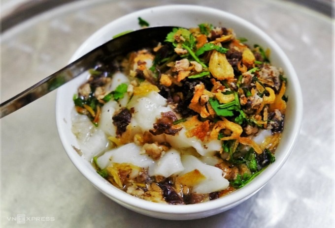 Đây thực chất là một cách biến tấu khác của món bánh đúc truyền thống, thay vì để nguội cắt miếng chấm tương thì bánh đúc được ăn trong lúc vẫn còn đang đun nóng và dẻo quánh. Bánh đúc nóng sẽ ăn kèm nước chấm chua ngọt, thịt xay xào mộc nhĩ, rau mùi tươi xắt nhỏ, hành khô phi vàng và rắc thêm tiêu, ớt bột. Khoảng 15.000 - 20.000 đồng một bát vừa vặn để lót dạ xế chiều. Một số địa chỉ bán bánh đúc nóng đông khách hiện nay nằm ở phố Lê Ngọc Hân, khu tập thể Trung Tự, phố Nguyễn Hiền... Ảnh: Khánh Trần