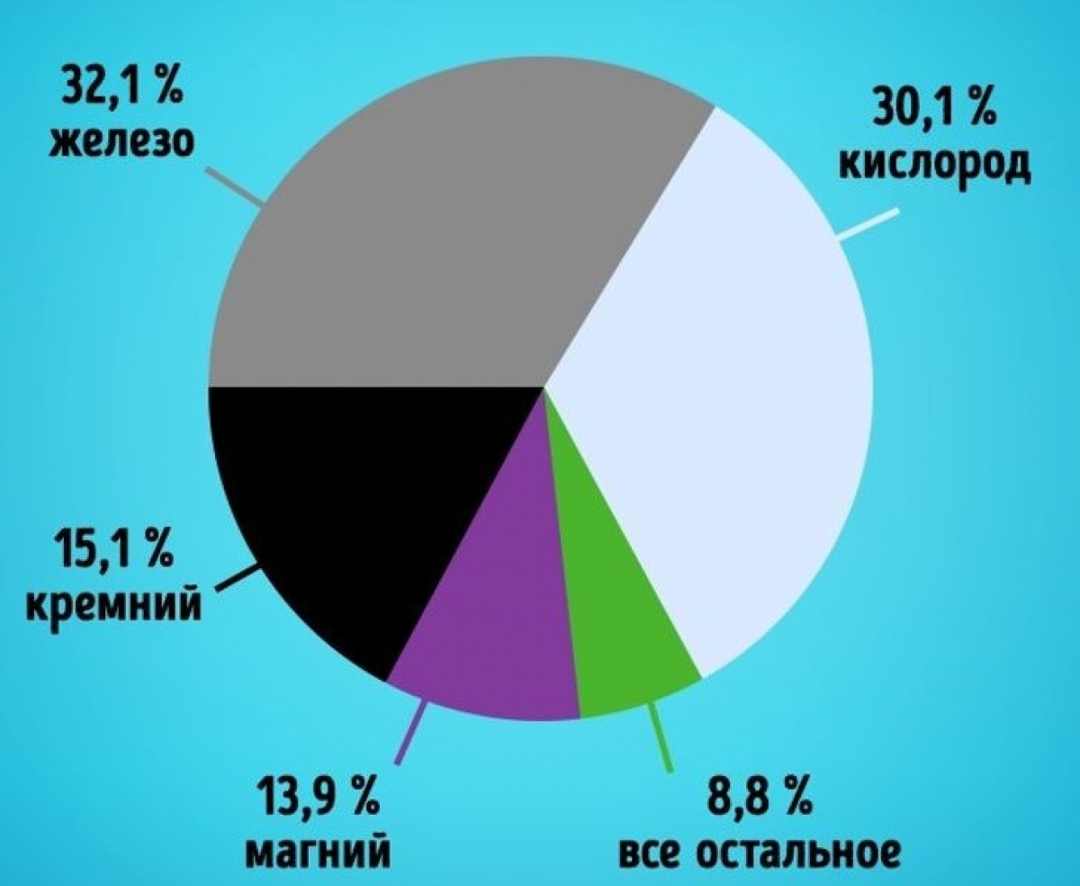 Trái Đất được cấu tạo bởi sắt, oxy và silic. Nếu chúng ta muốn phân chia hành tinh theo thành phần, nó sẽ giống như sau: sắt 32,1%, oxy 30,1%, silic 15,1%, và magiê 13,9%. Người ta tin rằng hầu hết sắt (khoảng 90%) được tìm thấy trong lõi Trái Đất và phần lớn oxy (khoảng 47%) ở vỏ Trái Đất.