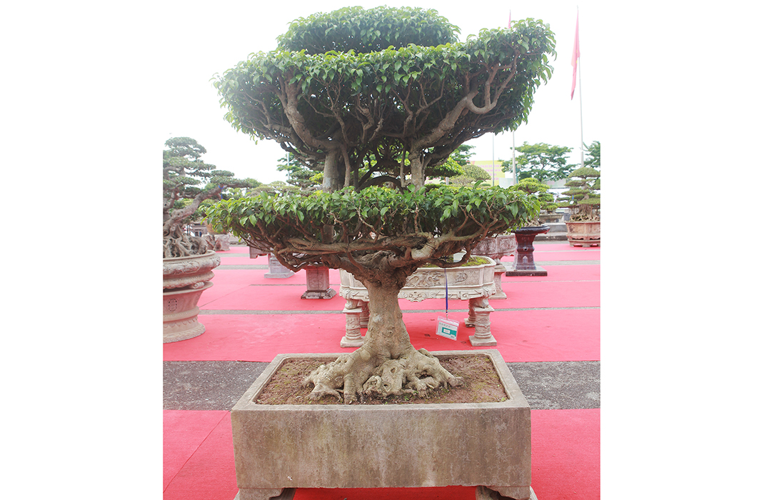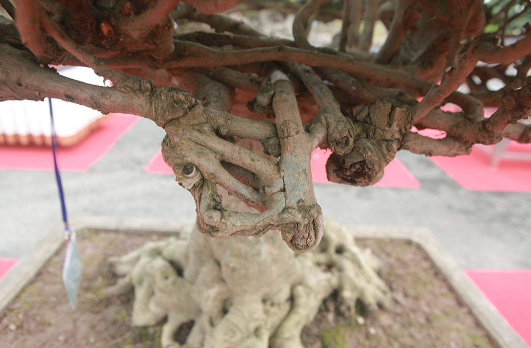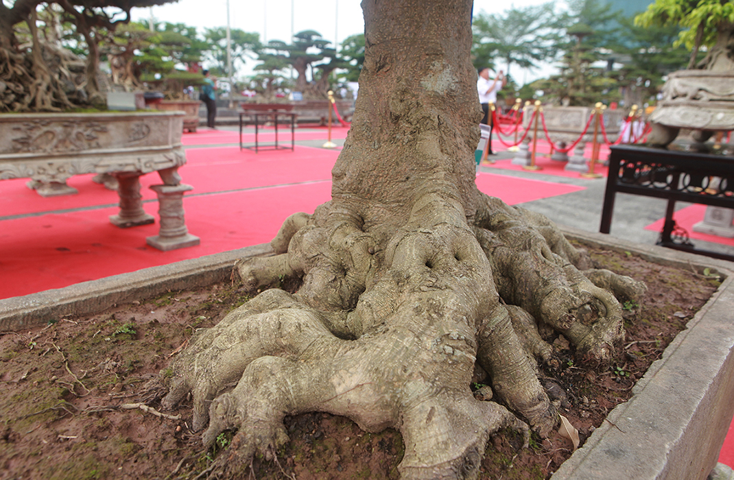 Bệ rễ lớn, tạo thế vững chãi cho tác phẩm. Cây có tuổi đời gần 100 năm nên rễ, thân nổi u cục, tưới nước vào cây – vỏ cây nổi lên một màu đồng rất đẹp.