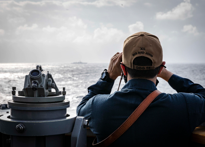 Sĩ quan hải quân Mỹ dùng ống nḥm quan sát từ khu trục hạm USS John S. McCain di chuyển trên Biển Đông hồi tháng 2/2021. Ảnh: Hải quân Mỹ.
