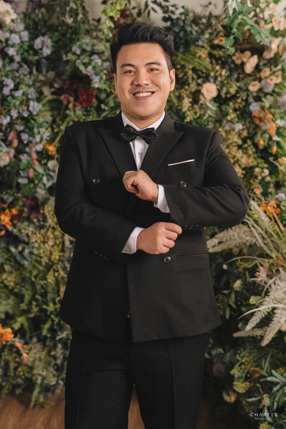 Chiều nay - 4/1, hôn lễ của cặp đôi được tổ chức ấm cúng tại gia đình. Bố ruột của chú rể - diễn viên Chu Hùng - chỉn chu trong bộ vest cách điệu để lo liệu các thủ tục trong hôn lễ của con trai.