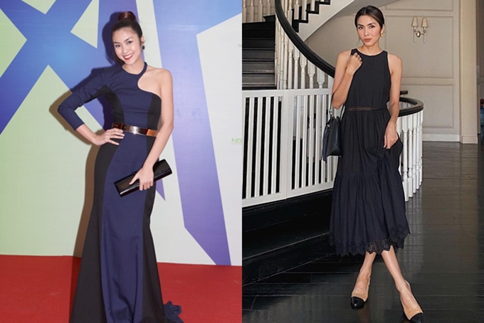 Tăng Thanh Hà trên thảm đỏ lễ trao giải Ngôi sao của năm 2011 (trái) và hiện tại.