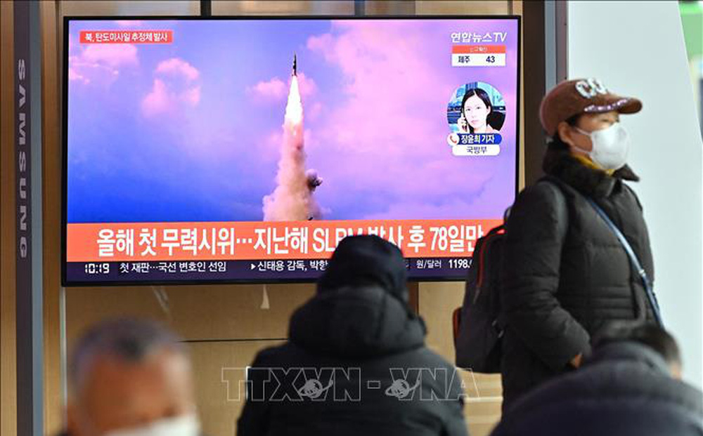 Người dân theo dõi qua truyền hình ở nhà ga Seoul (Hàn Quốc) về vụ phóng vật thể được cho là tên lửa đạn đạo của Triều Tiên, ngày 5/1/2022.