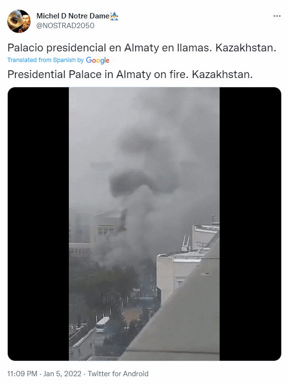 Theo tin mới nhất, dinh tổng thống Kazakhstan cũng đã "chìm trong biển lửa" và những người biểu tình cũng từng kiểm soát sân bay ở Almaty.