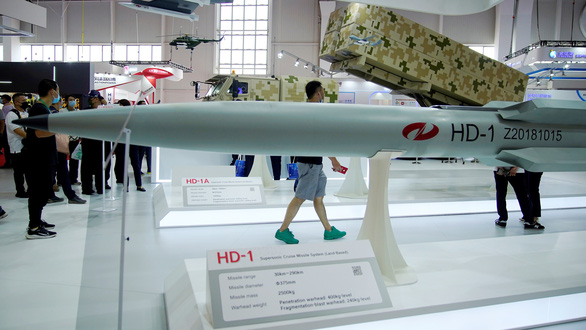 Mô hình hệ thống tên lửa hành trình siêu thanh HD-1 của Trung Quốc trưng bày tại Triển lãm hàng không và vũ trụ quốc tế ở TP Chu Hải hôm 29-9. Ảnh: Reuters